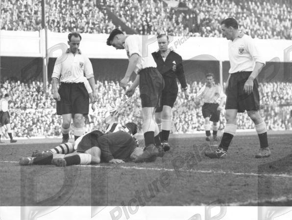 - VGC - Arsenal No 9 Holton (in striped shirt) is down after a collision with Pool keeper Farm. Looks painful - but both were fit to resume soon after. Quarter final tie with Blackpool (in white) on their way to Wembley, winning this game 2-1