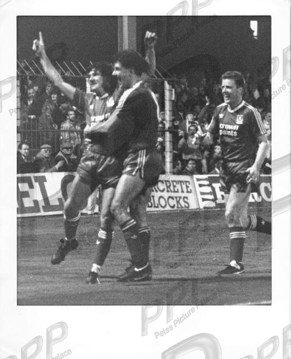 VGC - Ray is hugged after opening scoring against the Dons at Plough Lane