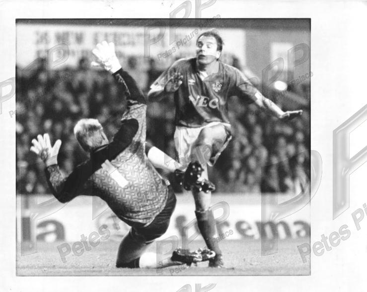 VGC - wide trim edge - Erik gets a block in on Sharp. The Norwegian keeper won 97 caps for his country