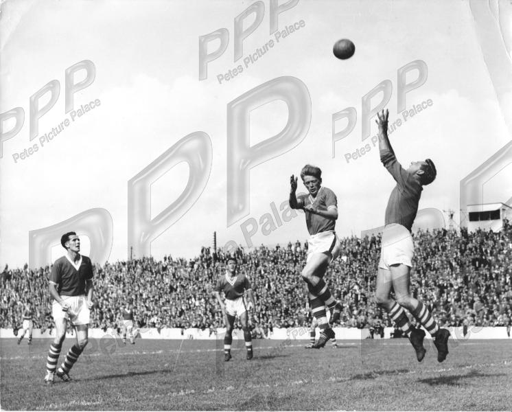 - VGC - up goes Boro keeper Peter Taylor to beat Gerry Hitchens to a cross, watched by Bill Harris of Boro and new signing Johnny Nicholls of City (he only played 8 times). Boro won this match 2-0.