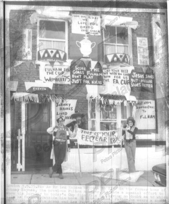 - VGC - WIRE - Mr Len Haines lived in the house formerly owned by the great Johnny Haynes, and with the 1975 Cup Final approaching he decorated it with all the FFC stuff he could find - and could make himself. And he's standing there with friends Lee Ferris and Jim Adams. Bravo sir! Even though Johnny Haynes was spelt with a Y !!