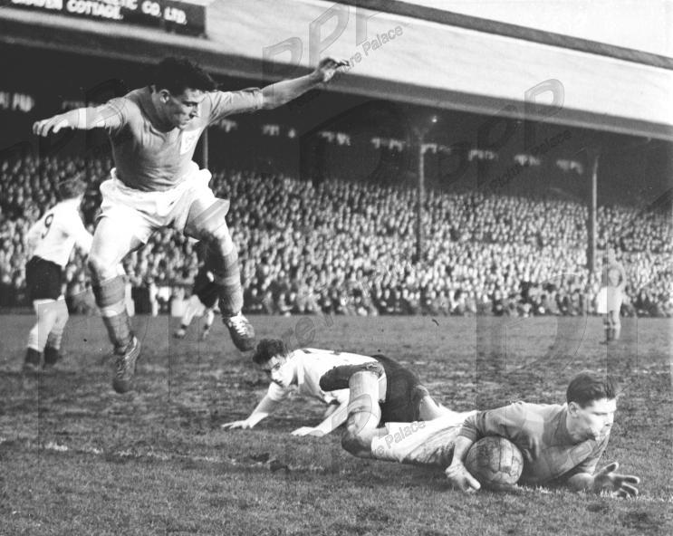 - VGC - Bury keeper McLaren clings on to the ball, Haynes was knocked over and Shakers defender Robertson leapt over him and has been frozen there for 63 years! Bury won this game 3-1.