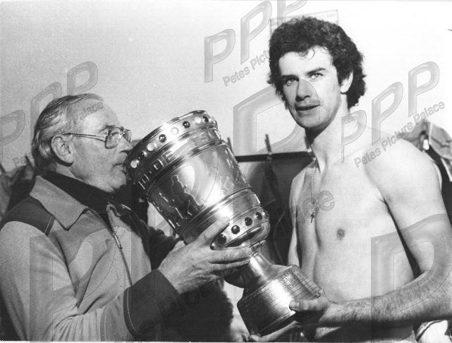 VGC - Koln defender Gerd Strack holds the Pokal trophy for coach Hennes Weisweiler to have a sip of the contents - Liebfraumilch maybe?