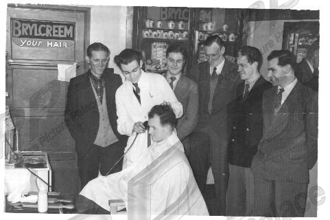 Good, horizontal crease across. Team smartening up before FA Cup 3rd round match at West Ham, Jan 51. Alf Sherwood is the man in the chair.