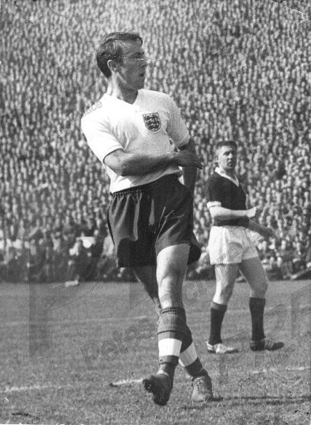 Good - sl corner crses and a slit through at eye level which has been repaired to reverse by sellotape under the PA label. Jimmy whose England goal-scoring record stood for 50 years, give or take.