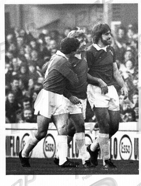 VGC - Latchford celebrates his goal with Bernard & Hamilton, who was to add to the scoreline later - match v Birmingham, Dec 75.