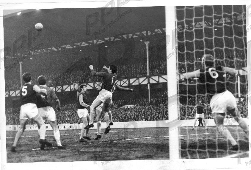 - VGC - Ferguson clears from Hurst (hidden) while #5 Stephenson, #6 Moore, Peters and Redknapp provide cover. Everton won 1-0.