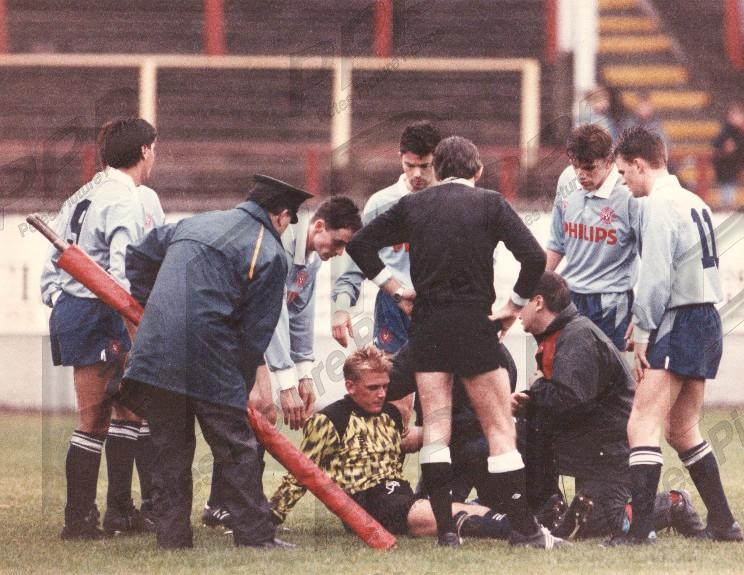 VGC - game at Partick, and Accies players cluster round injured keeper Ferguson as the stretcher is prepared