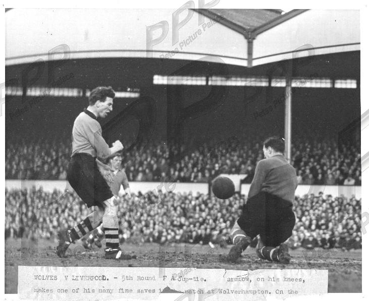 - VGC - v sl corner crses + pinholes - torn narrative strip stuck to front - Liverpool keeper Sidlow (ex Wolves) makes another fine save from the approaching Smyth (future Liverpool) in this 5th round tie at Molineux won 3-1 by Wolves in front of 55,000 fans
