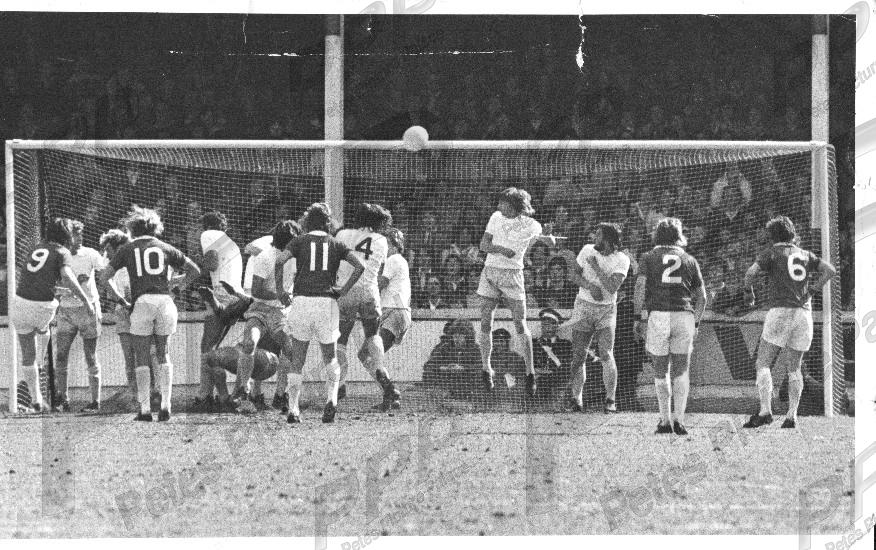 - Good - crsed along top edge, 1" tear fixed by tape to rear - it's all happening here - about 14 players visible in this image, looks like Latchford (9) has shot and it's going over or maybe has been deflected over. Everton won 2-0 but Bob wasn't a scorer (Pearson & Bernard)