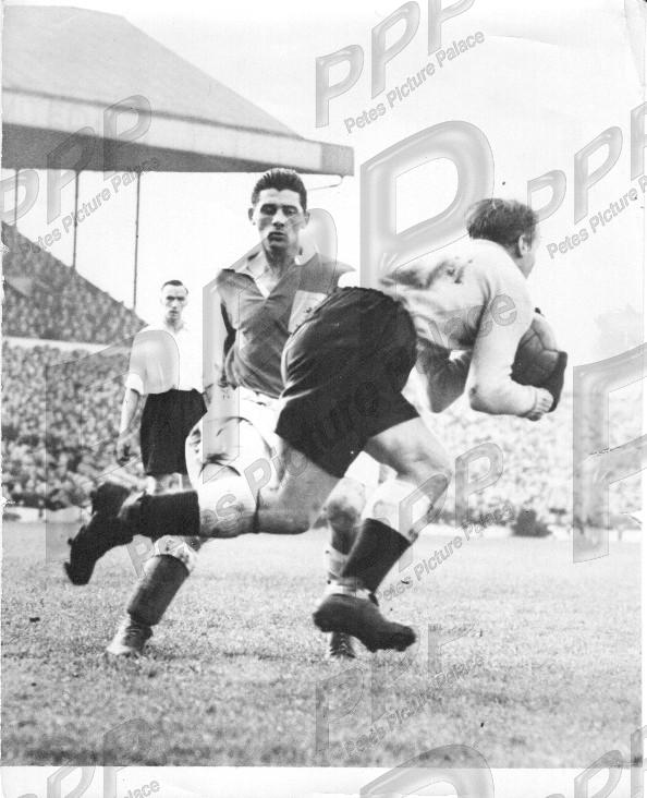- VGC - 1" tear on rhs fixed by sello to rear, v sl edge tears & sl crses elsewhere - Welsh centre forward Trevor Ford just beaten to the ball by keeper Bert Williams - Ford had just joined Sunderland from Villa for a record £30k, while Williams was at Wolves so no love lost between the former West Midland rivals. Ford had quite a reputation for rough-housing opposing keepers, but he never batted an eyelid if and when he got it back. This match at Ninian Park in the Home Internationals ended in a 1-1 draw with 60,000 in attendance.