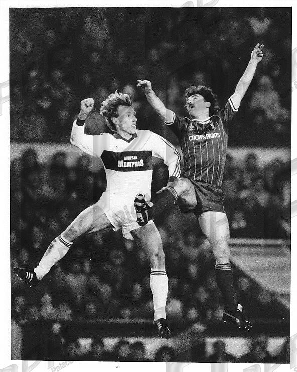 - VGC - John in the air with Erich Obermayer, who scored an own goal as Pool ran out 4-1 winners in this European Cup, 3rd round, second leg, match
