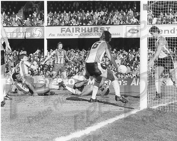 VGC - Cyrille's shot is hacked off the line by Nicholl with bodies flying everywhere