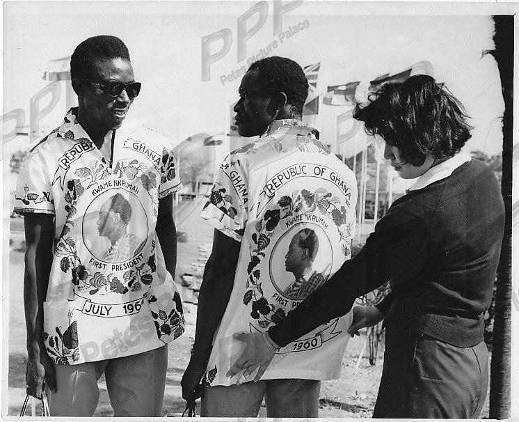 VGC - 2 Ghanaian players sporting their brightly coloured shirts backing their new President Kwame Nkrumah as they made their way around the Olympic village in Tokyo - with many admiring glances coming their way from their hosts!