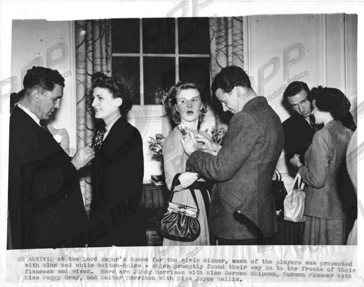- VGC - narrative label stuck along bottom edge - 3 players (Jimmy Harrison, Norman Plummer & Walter Harrison) with girlfriends (Doreen Shipman, Peggy Gray & Joyce Wallis) attending a civic dinner with the Lord Mayor of Leicester after the FA Cup Final.