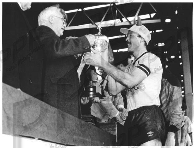 VGC - United skipper Mal collects the trophy after their famous Milk Cup win over QPR