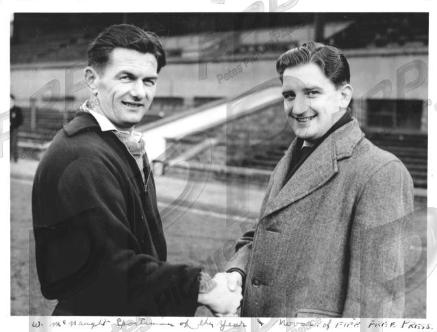 VGC - writing on lower trim edge - Willie accepts the award of Sportsman of the Year from Mr Novar of the Fife Free Press. Father of Ken (Everton/Villa etc), Willie played at centre half for Raith from 1946 to 62, making over 430 appearances - and also he won 5 Scots' caps