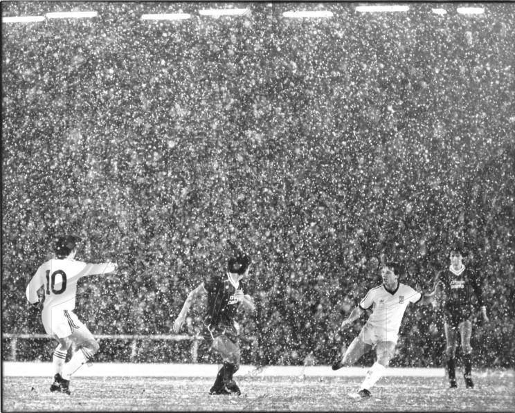 VGC - v sl crses - down comes the snow as the League Cup quarter final v West Ham goes ahead and the Reds win 2-1 - from right the players are Hansen, Goddard (?), Johnson perhaps and Van Der Elst maybe? I used to be decisive.....